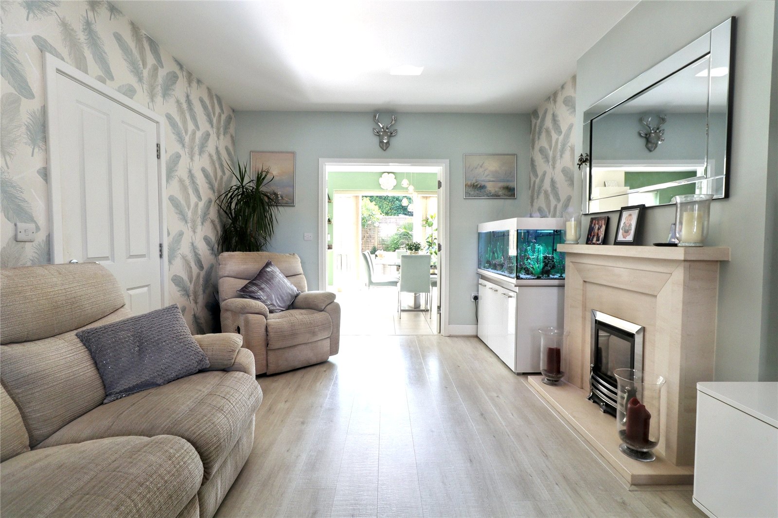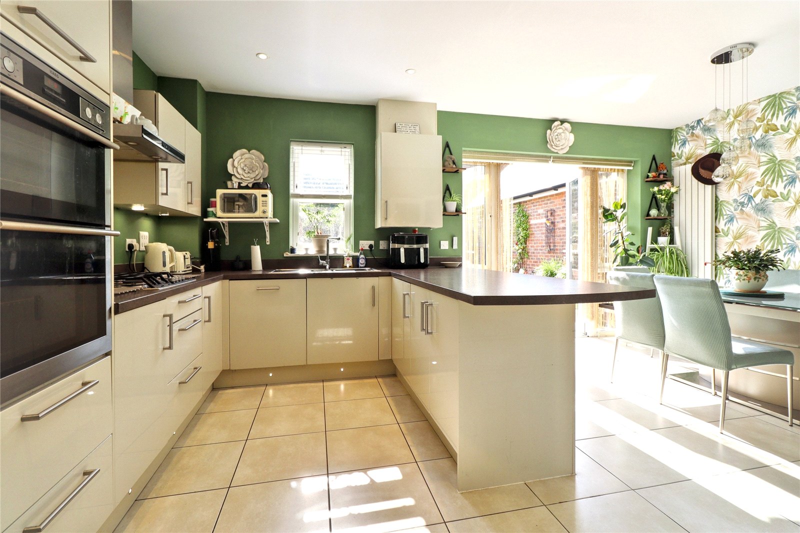 At the heart of the home is a bright and spacious kitchen/diner, complete with integrated appliances, a breakfast bar, and French doors that open onto the landscaped rear garden. A generous living room sits at the front of the property and features a large bay window and a gas fireplace. The ground floor also benefits from a cloakroom and useful under-stairs storage.